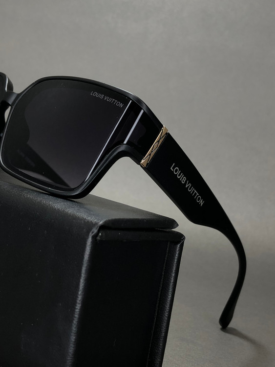 عینک فریم مستطیل شیشه منحنی تمام مشکی که فقط یه نوار طلایی داره بین دسته و بدنه