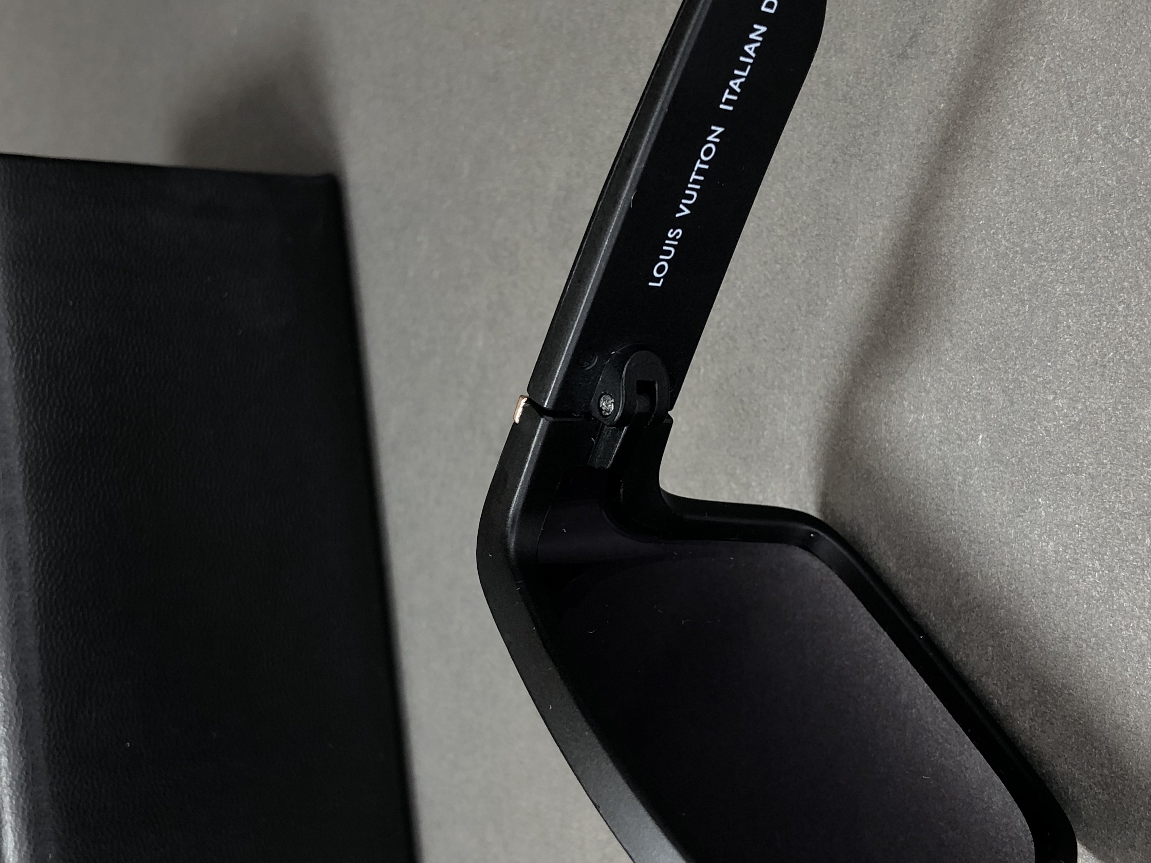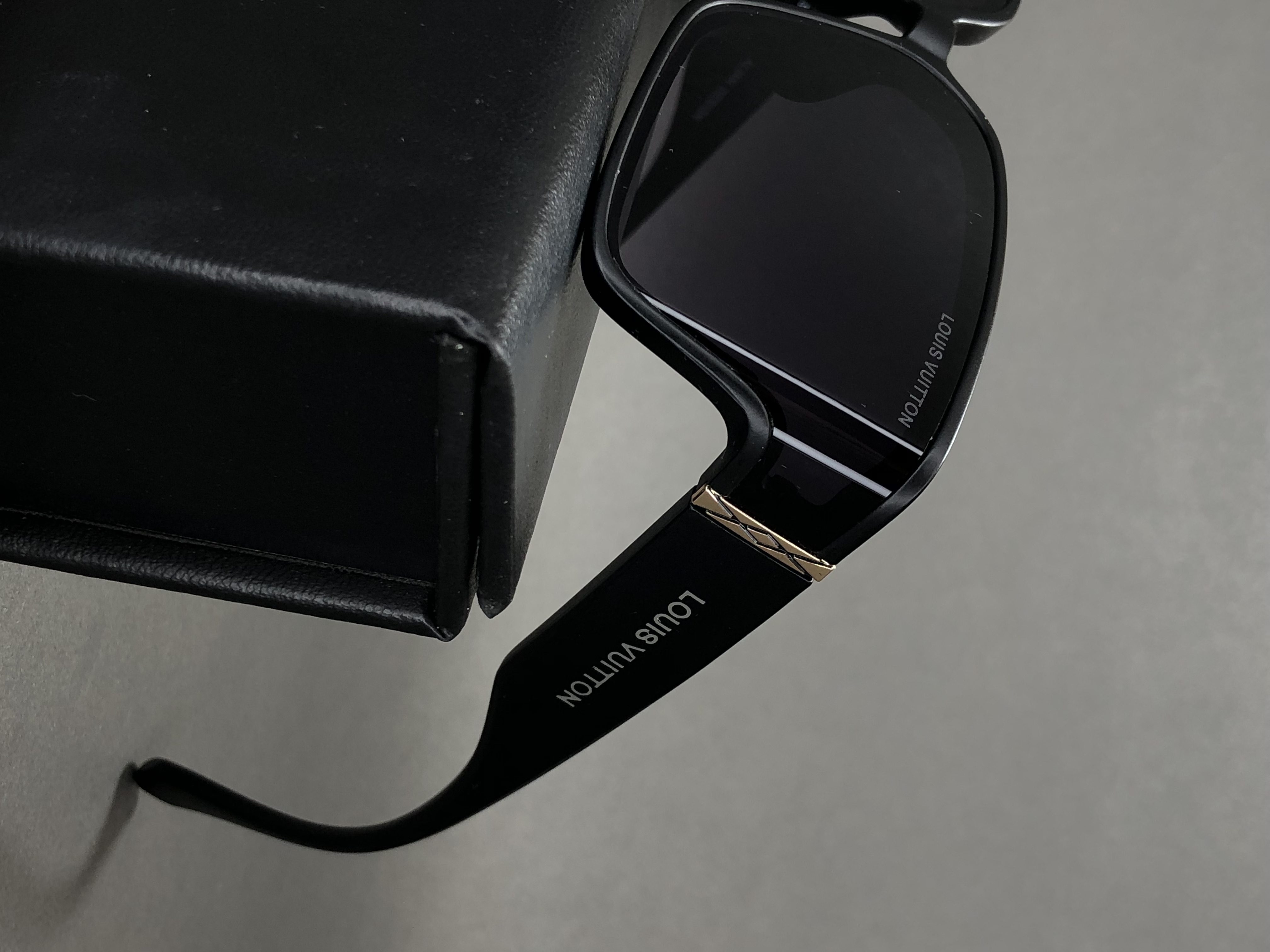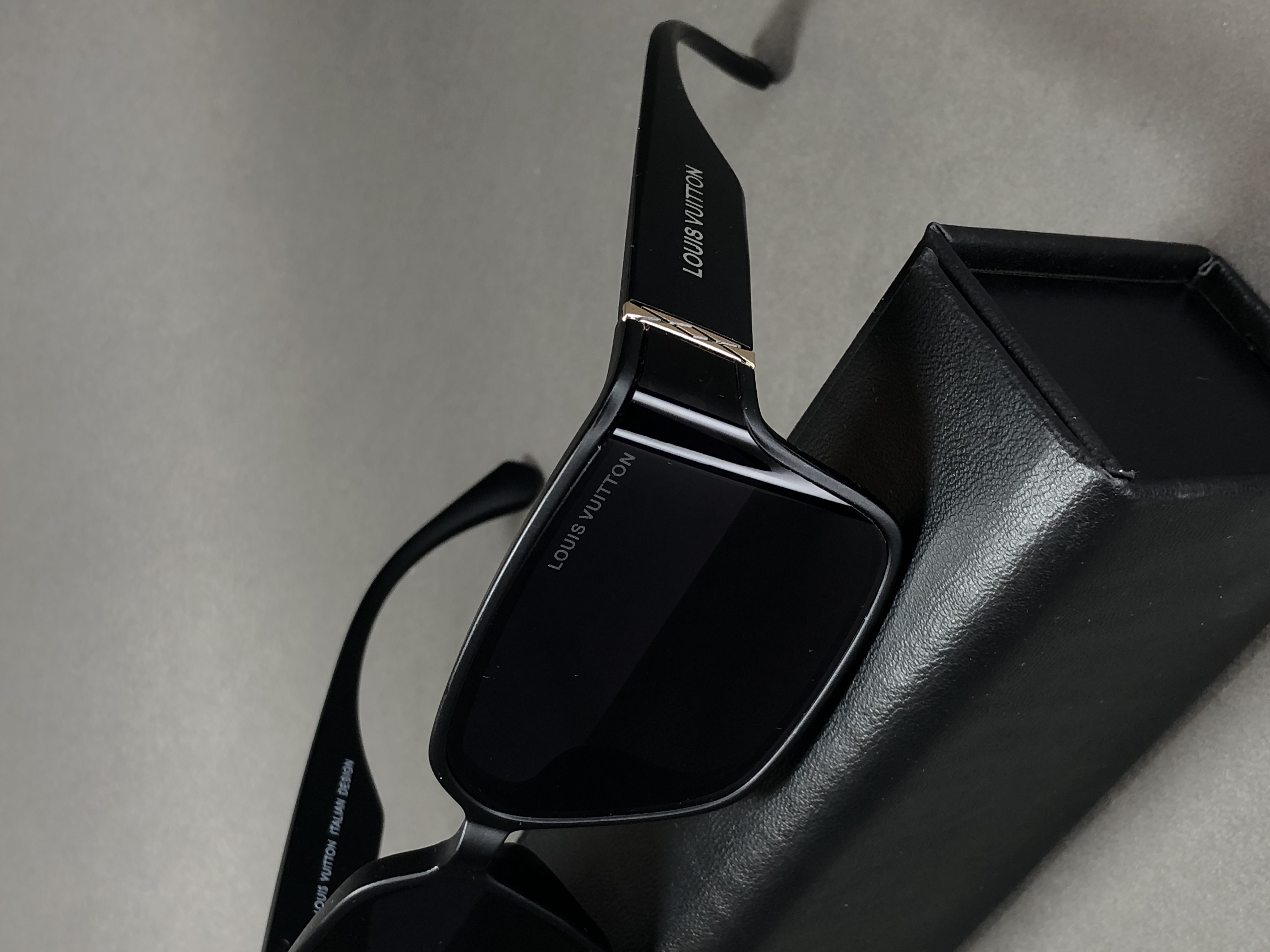عینک فریم مستطیل شیشه منحنی تمام مشکی که فقط یه نوار طلایی داره بین دسته و بدنه
